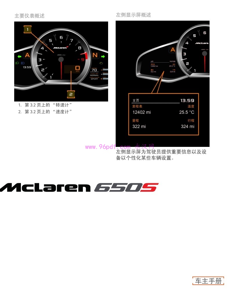 本部分包含关于设备和安装于 McLaren 车的行车控制装置的详细信息,以及在行车期间如何高效地使用这些控制装置。